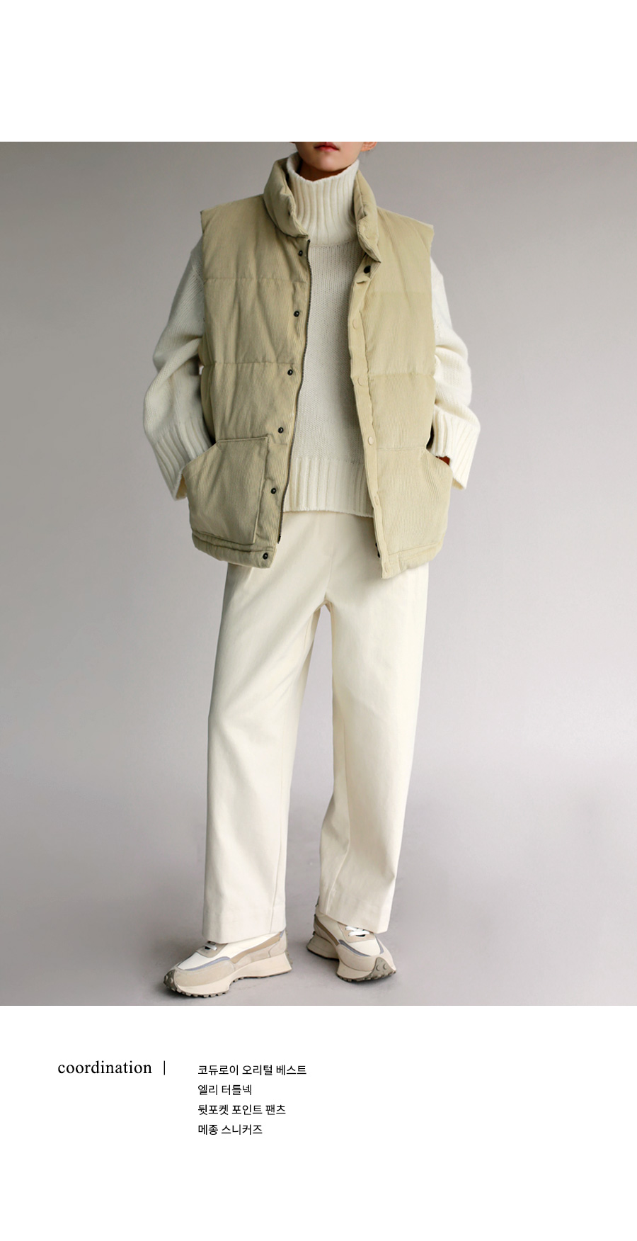 | 모델 착용정보 | J.Y 모델 (키 167cm, 상의 마른 55, 하의 26 inch, 신발 240mm) : 아이보리 E.A 모델 (키 168cm, 상의 마른 55, 하의 25 inch, 신발 240mm) |