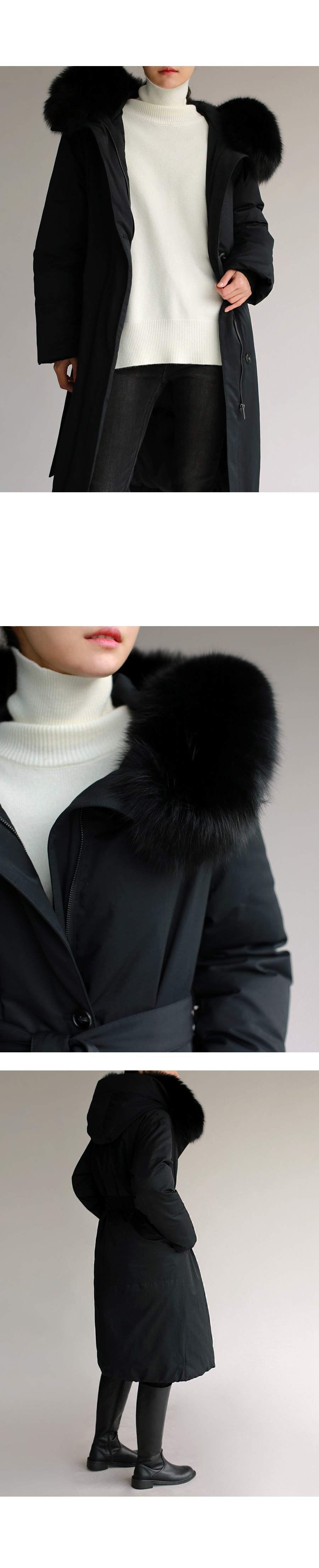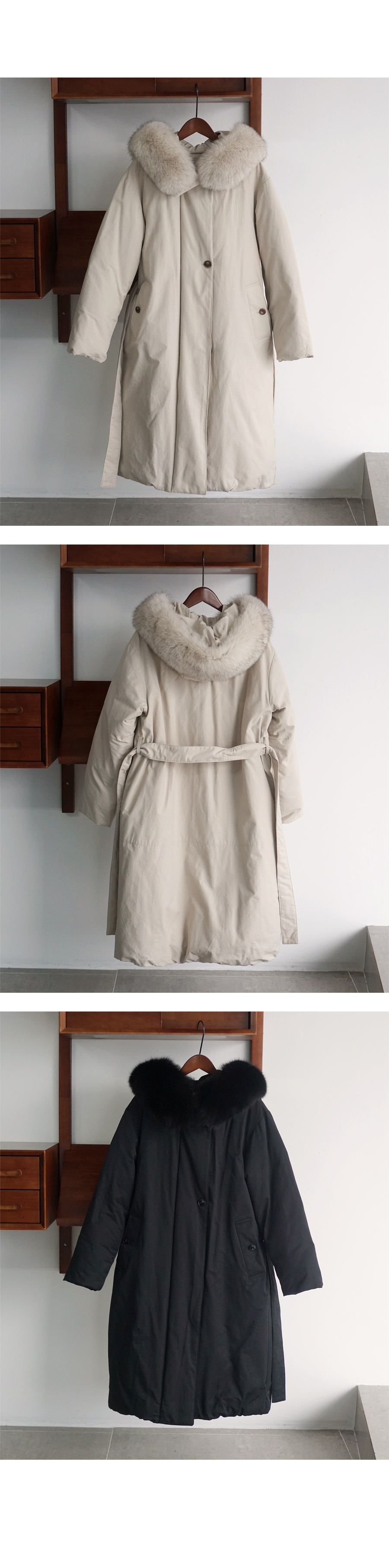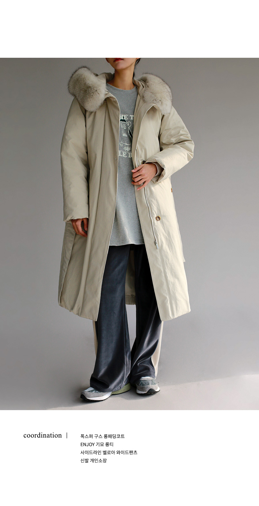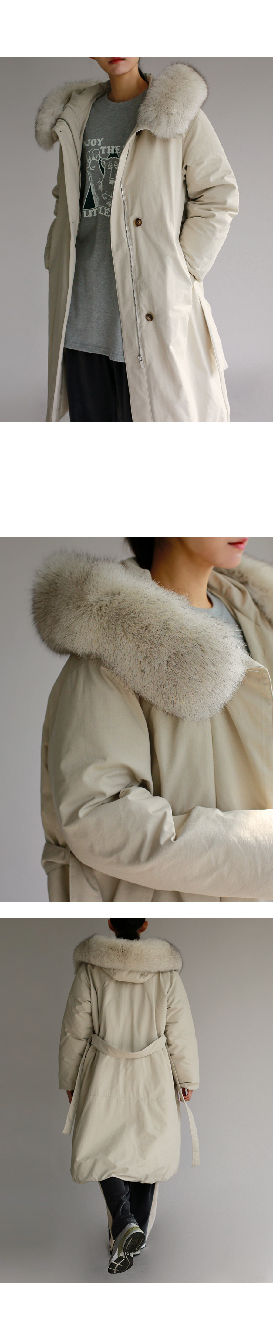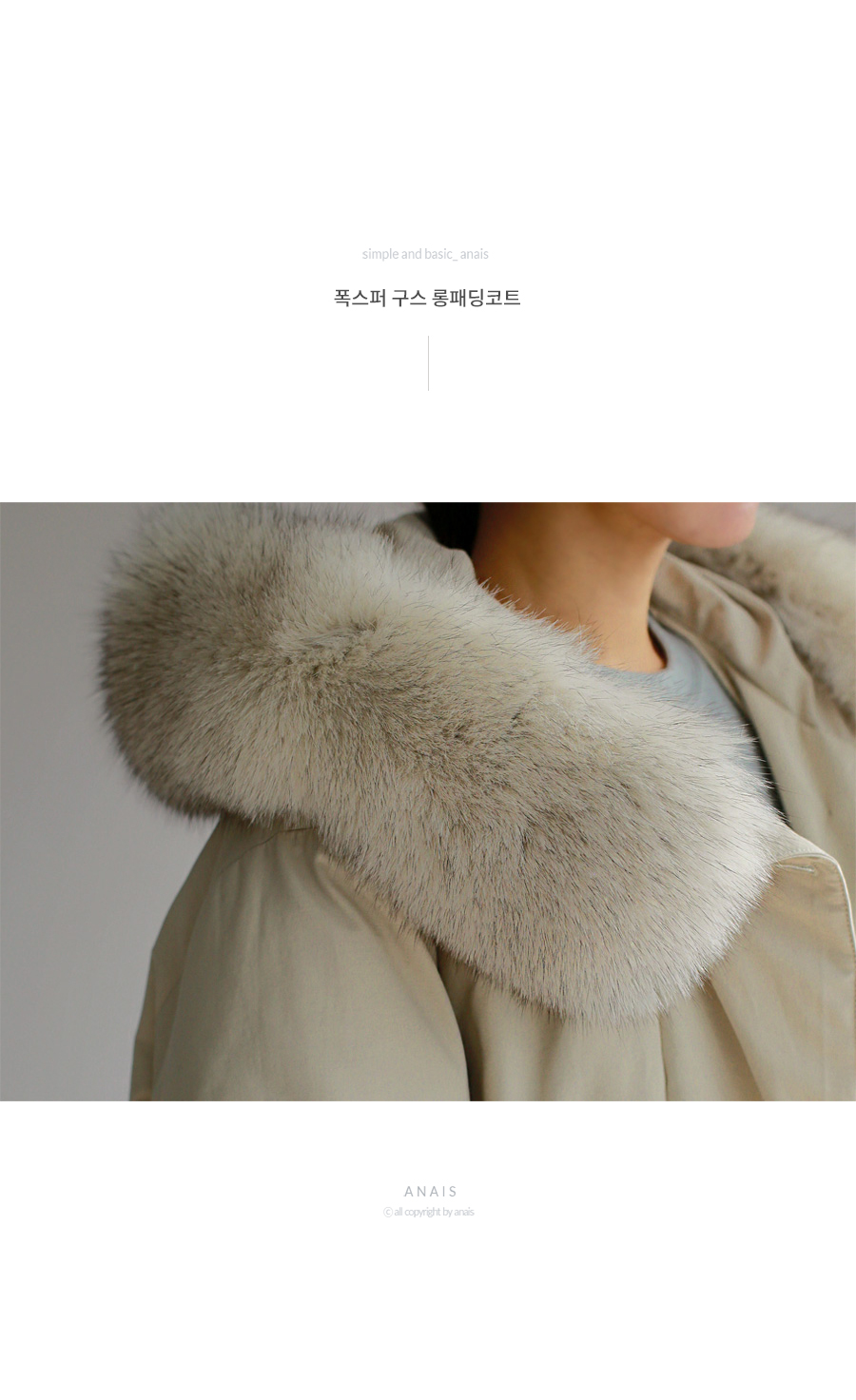 | 소재 | 후드퍼 : 리얼 폭스퍼 (탈부착가능) 겉감 : 면 63%, 나일론 37% / 안감 : 폴리 100% / 충전재 : 거위솜털 80%, 깃털 20% 배색(소매시보리) : 폴리 67%, 아크릴 25% 모 5%, 폴리우레탄 3% |
