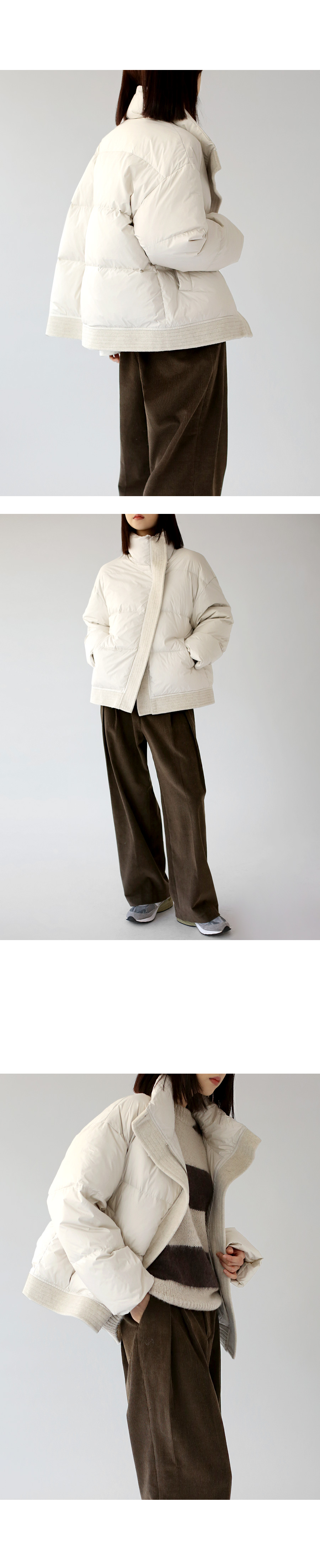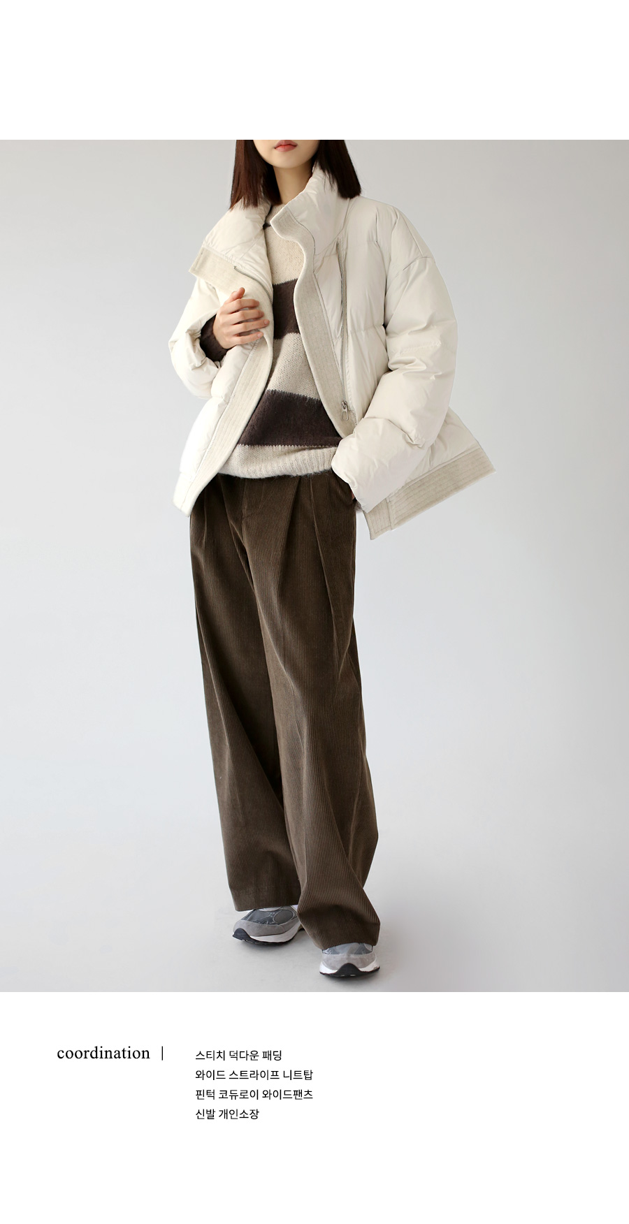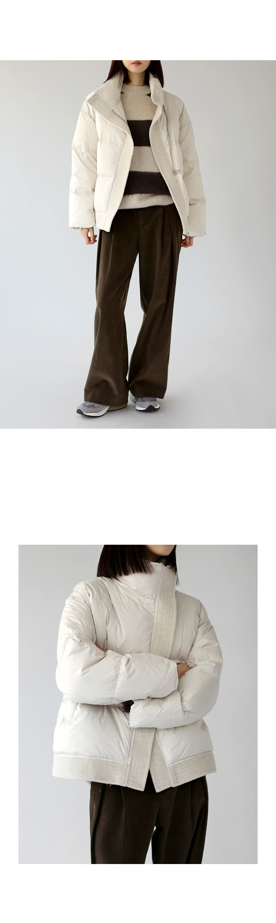 | 모델 착용정보 | J.Y 모델 (키 167cm, 상의 마른 55, 하의 26 inch, 신발 240mm) E.A 모델 (키 168cm, 상의 마른 55, 하의 25 inch, 신발 240mm) : 아이보리, 브라운 |