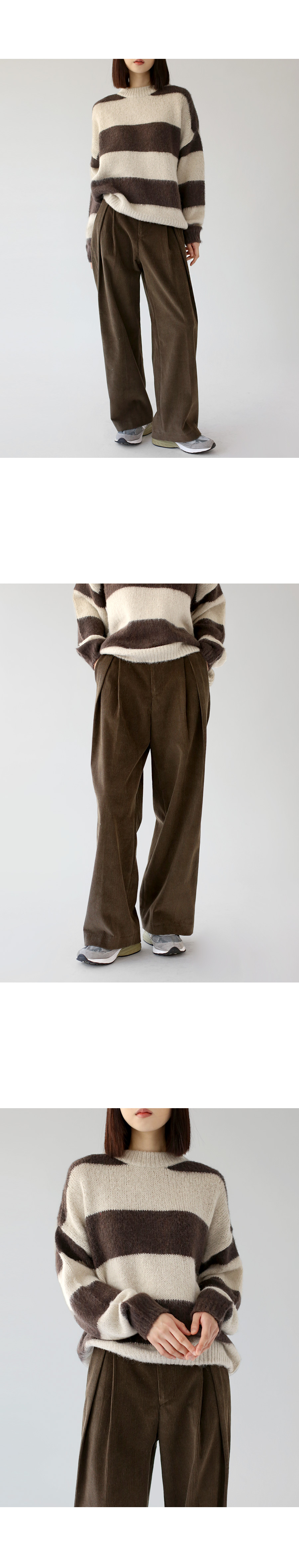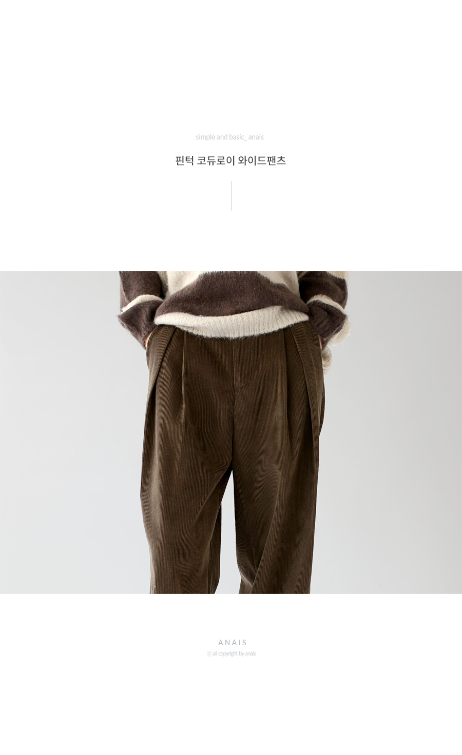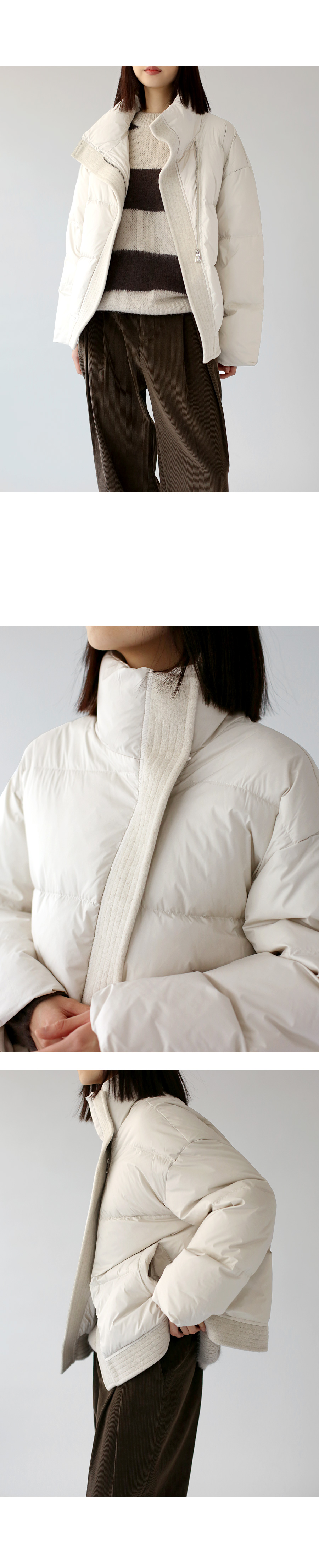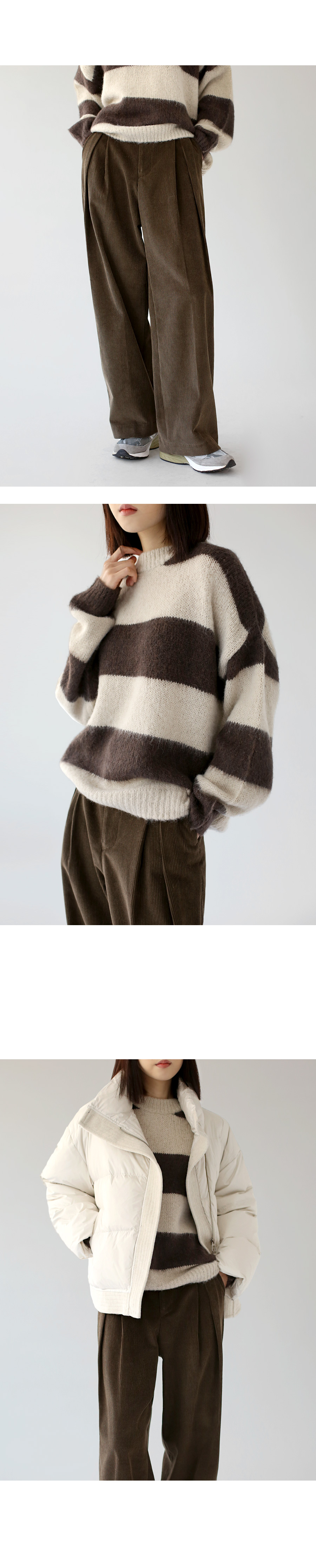 | 모델 착용정보 | J.Y 모델 (키 167cm, 상의 마른 55, 하의 26 inch, 신발 240mm) E.A 모델 (키 168cm, 상의 마른 55, 하의 25 inch, 신발 240mm) : 아이보리, 브라운 |