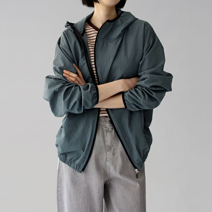 후드 둘레, 소매끝에 블랙 바이어스 배색 마감.
