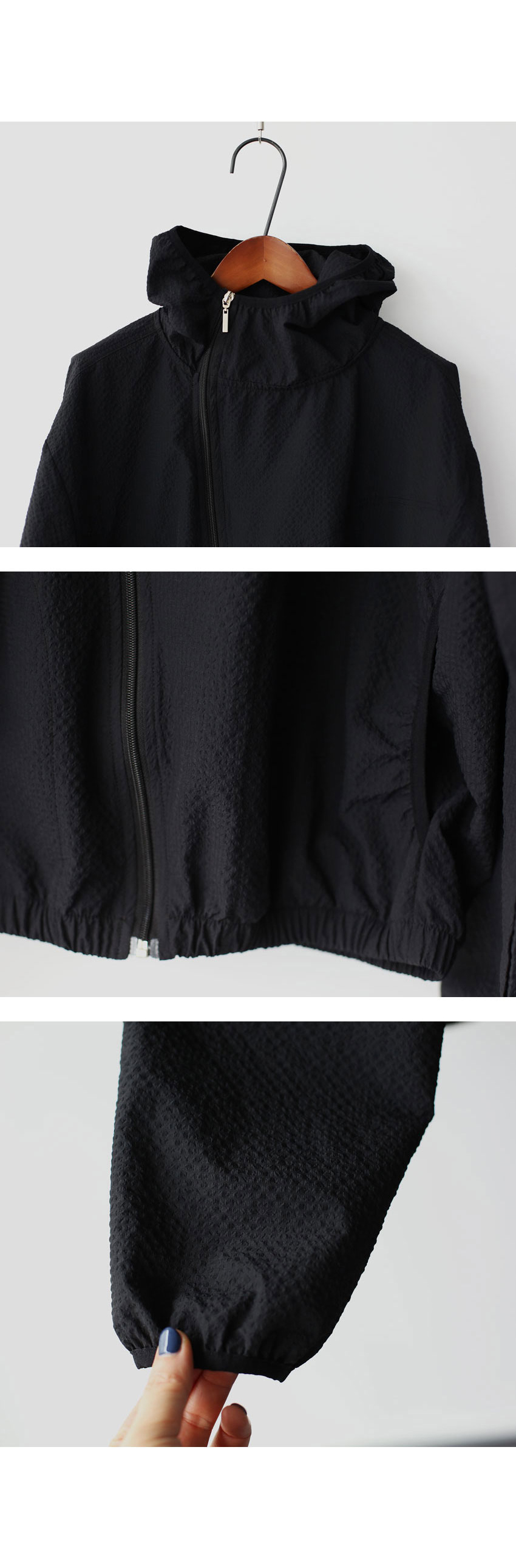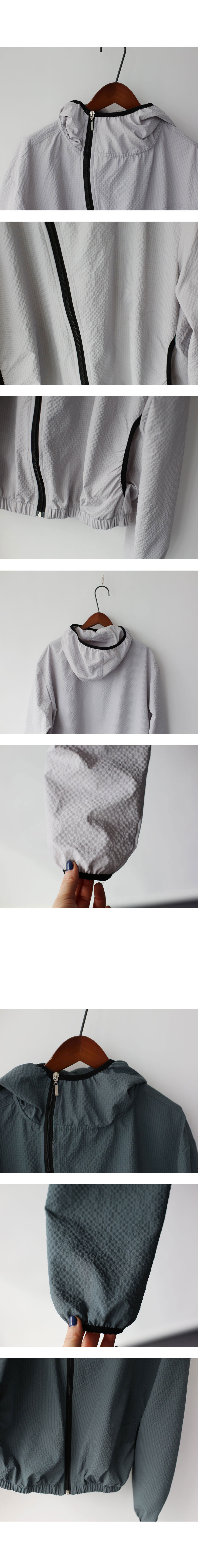 후드 둘레, 소매끝에 블랙 바이어스 배색 마감.